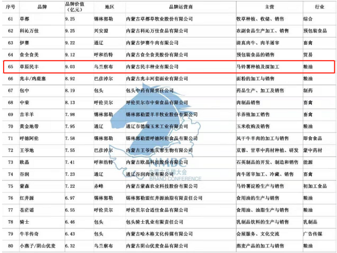 公司注冊有種薯“草原民豐”、鮮薯“敕勒川”和“塞宜德”、燕麥加工系列“陰山優麥”等品牌商標,其中“草原民豐”2013年被授予“內蒙古著名商標”,“草原民豐”牌馬鈴薯系列產品2013年被授信為“中國著名品牌”,并榮獲“第十一屆中國國際農產品交易會參展產品金獎”。公司自主選育的馬鈴薯新品種“民豐紅”,被評定為內蒙古“名優特”產品,2010年獲“中國民營科技創新成果金獎”,2015年正式通過自治區品種認定,同年榮獲“自治區主席質量獎”榮譽稱號。2017 年“民豐種業、草原民豐、敕勒川、塞宜德、陰山優麥”品牌被評為內蒙古農畜牧產品市場領先品牌,2018年榮獲“自治區優秀民營企業”稱號,2019年“草原民豐”品牌被評為“2019年內蒙古馬鈴薯產業行業標志性品牌”,內蒙古品牌價值評估值9.03億元,在內蒙古品牌總榜單排名第65位。2020年在抗擊疫情過程中,被湖北慈善總會、烏蘭察布紅十字會、烏蘭察布橋東社區等多地授予“愛心企業”稱號。