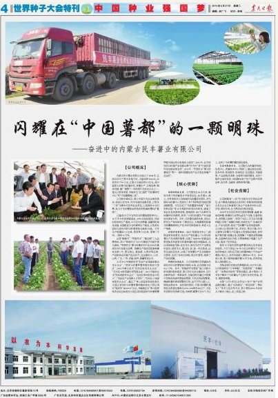 2014年5月27日,農民日報世界種子大會特刊以 “中國種業強國夢” 為主題刊登了《閃耀在“中國薯都”的一顆明珠——奮進中的民豐薯業有限公司》一文。