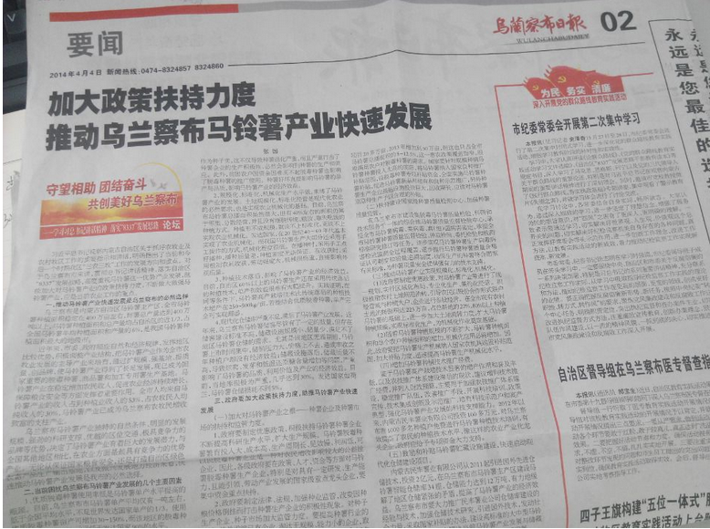 4月4日,烏蘭察布日報發表內蒙古民豐薯業有限公司總經理張國關于《加大政策扶持力度,助推馬鈴薯產業快速發展》的文章,文章指出: